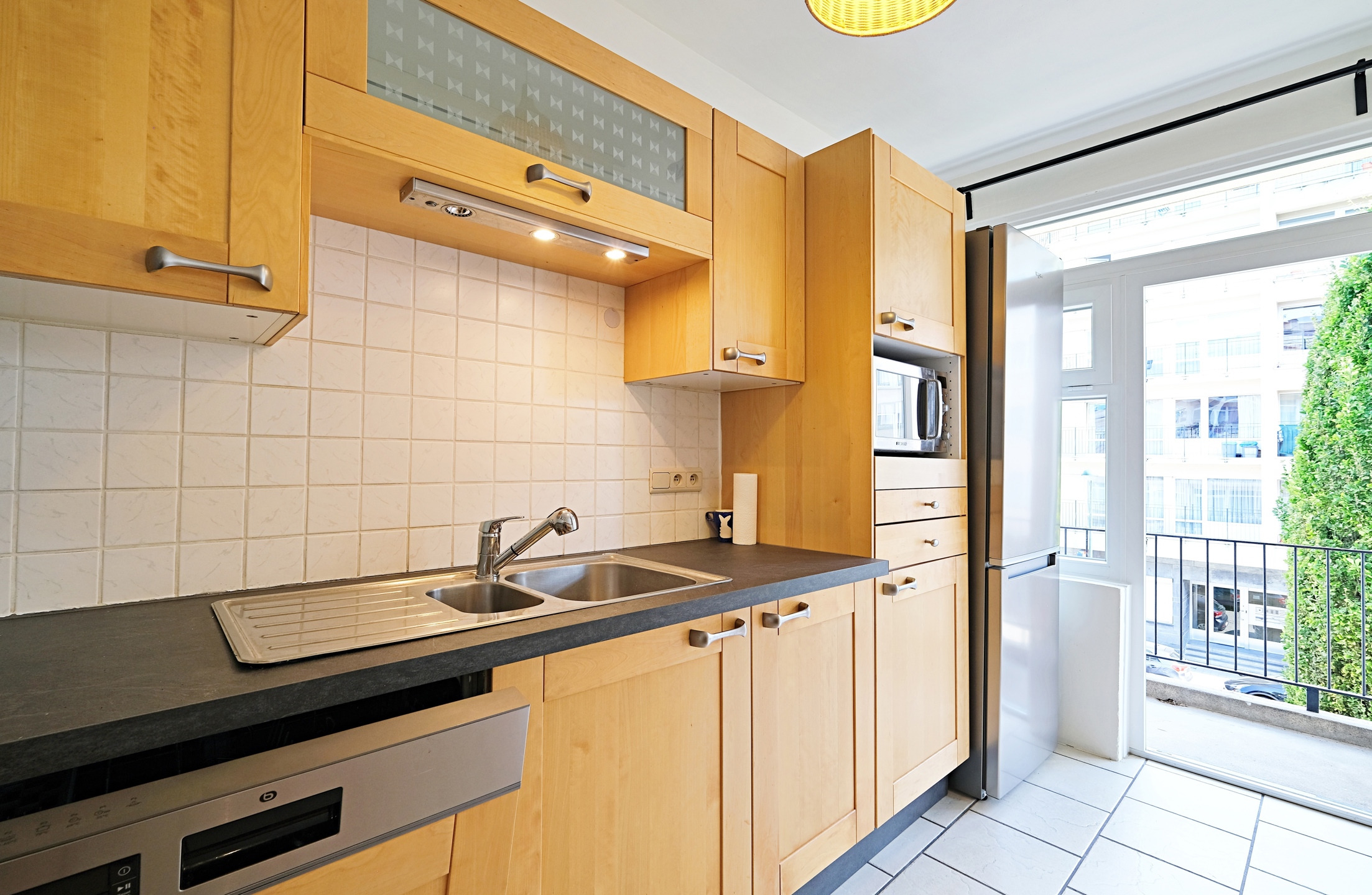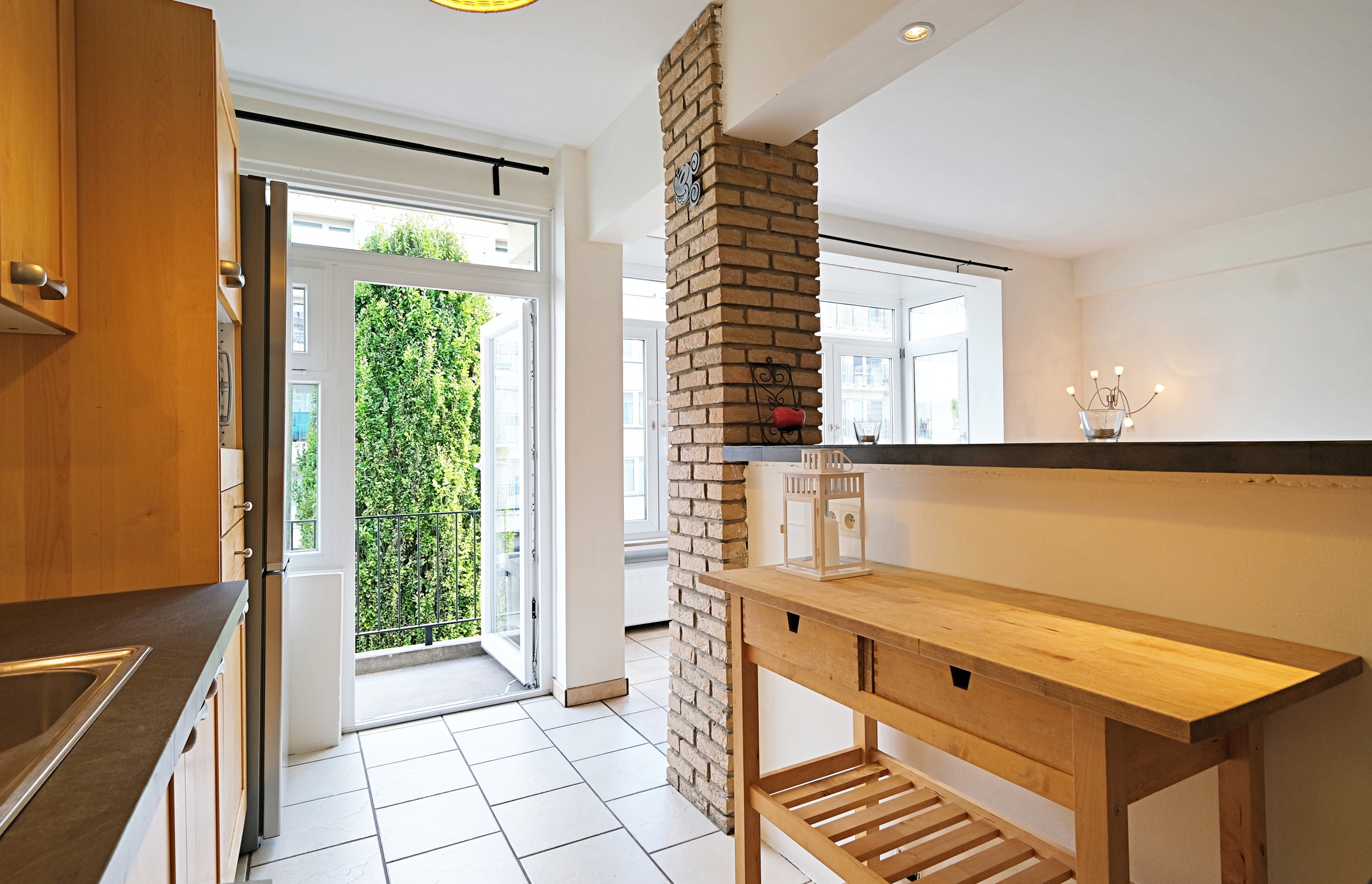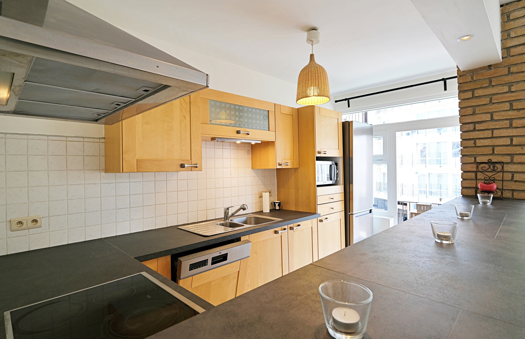 - A beautiful, fully equipped kitchen (oven, hob, extractor hood, fridge-freezer, dishwasher, and microwave) of 8 m² with a lovely breakfast bar on a low masonry wall with access to the 2 m² balcony