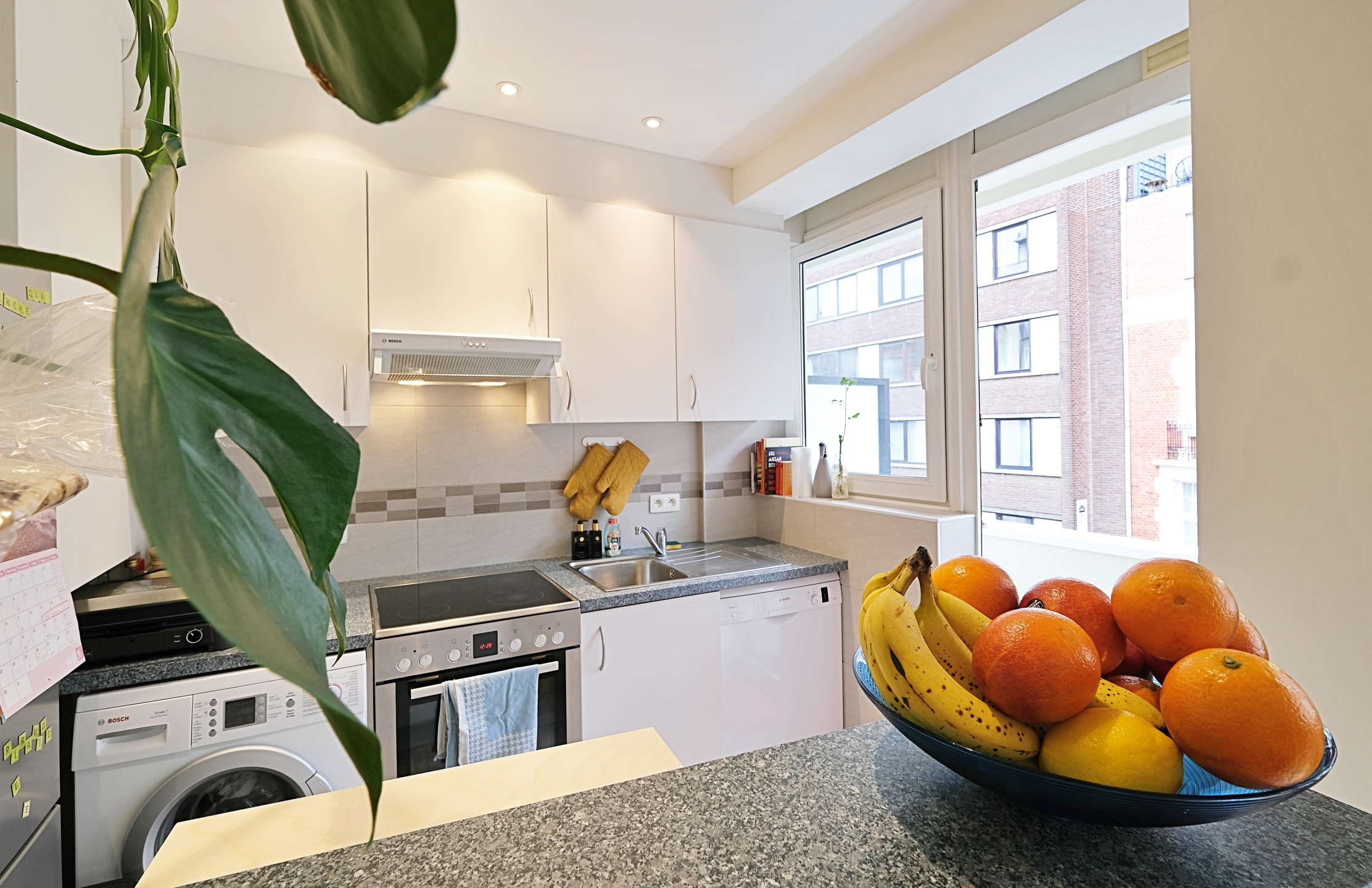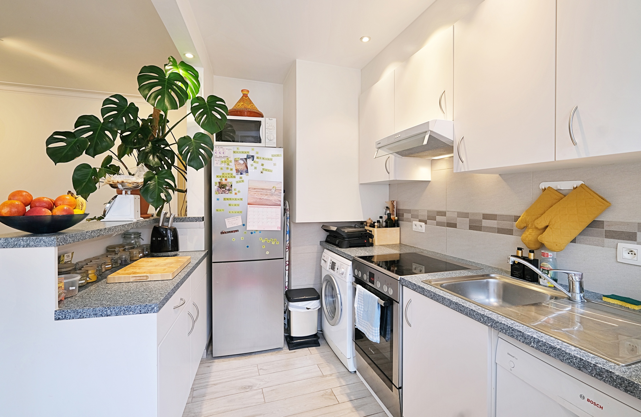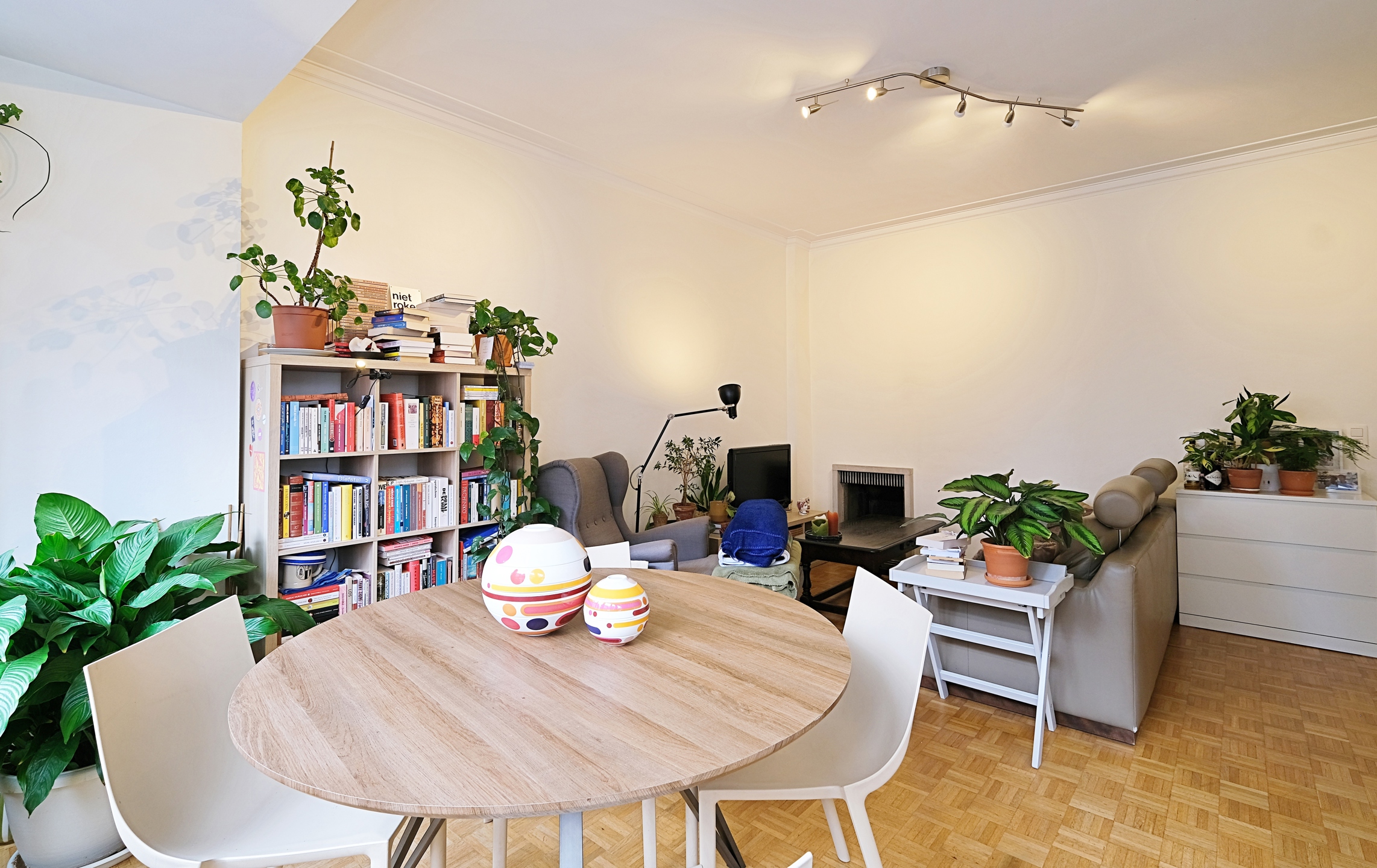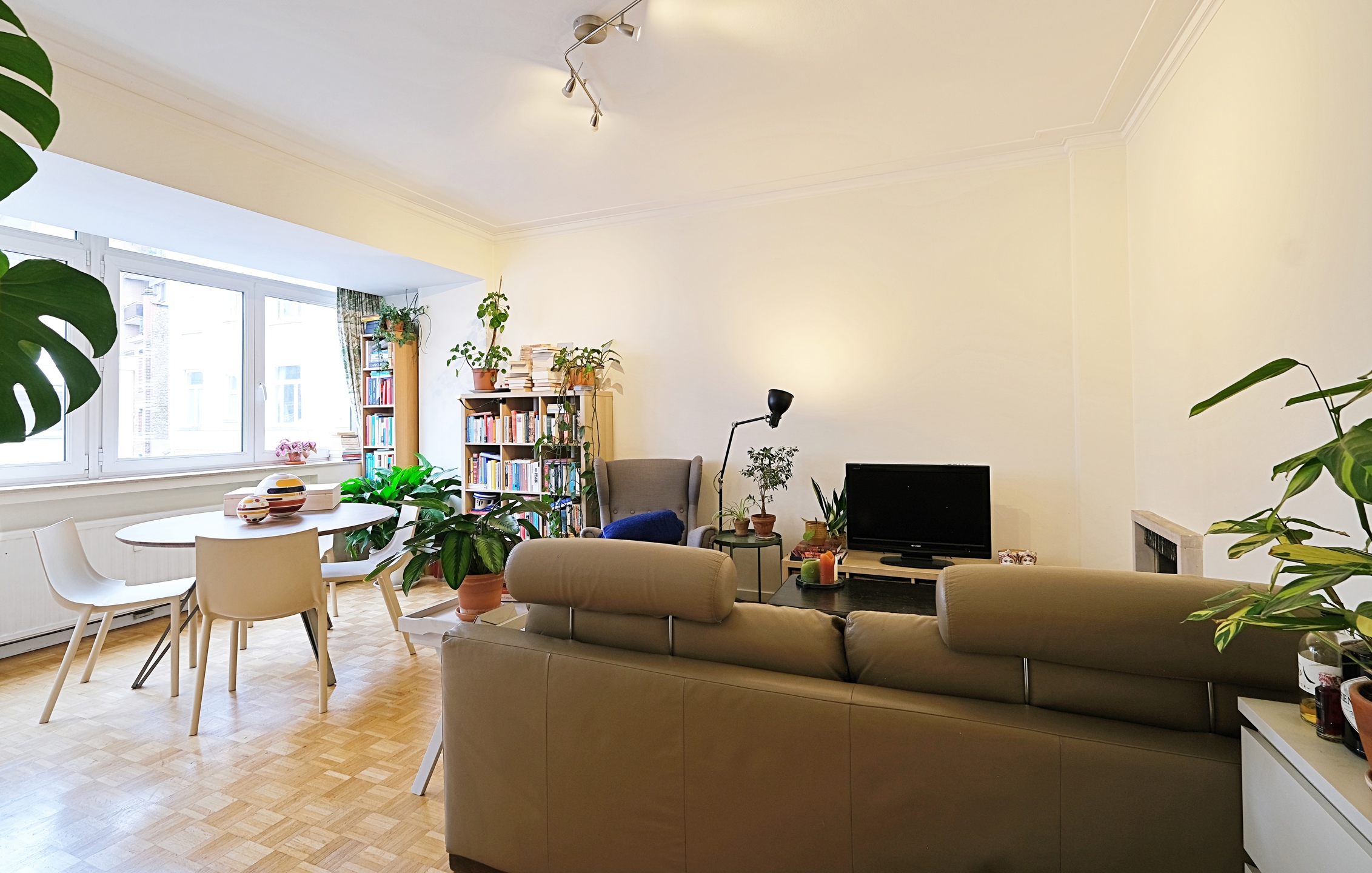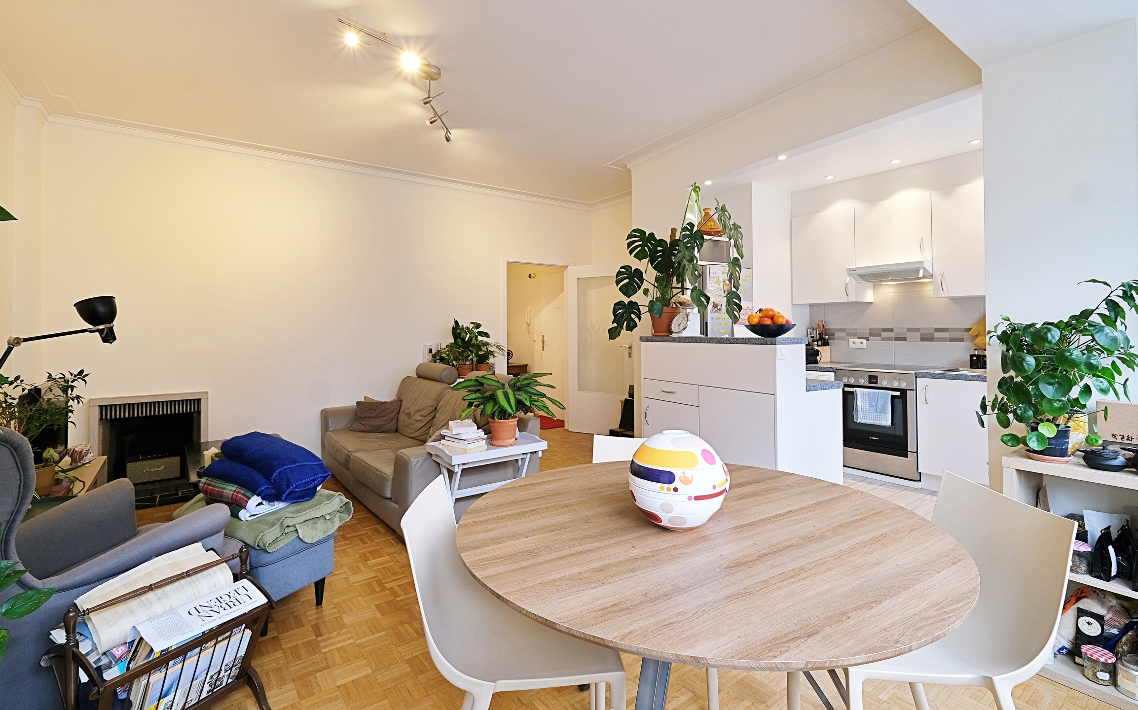 - Une grande et lumineuse pièce de vie d'environ 30 m2, composée d'un living avec un beau parquet d'origine et d'une belle cuisine équipée (taque et four électrique, grand frigo/congélateur, lave-vaisselle et hotte) avec accès à une petite terrasse sud;