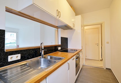 Il se compose d'une entrée avec parlophone et WC, une cuisine semi-équipée ouverte sur le living avec accès à une petite terrasse, 1 living/salon d'environ 23,5 m2 avec parquet et grandes fenêtres, 1 grande chambre d'environ 13 m2, une salle de bain et une cave. Un emplacement de parking souterrain et sécurisé complète ce bien pour 15 000€ supplémentaires (achat obligatoire avec l'appartement).