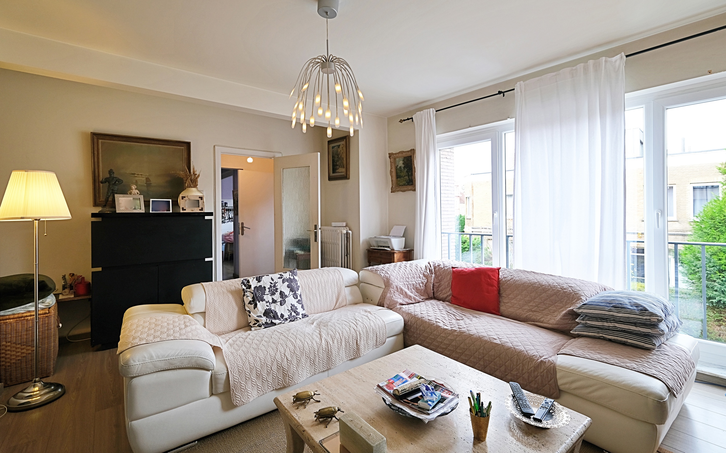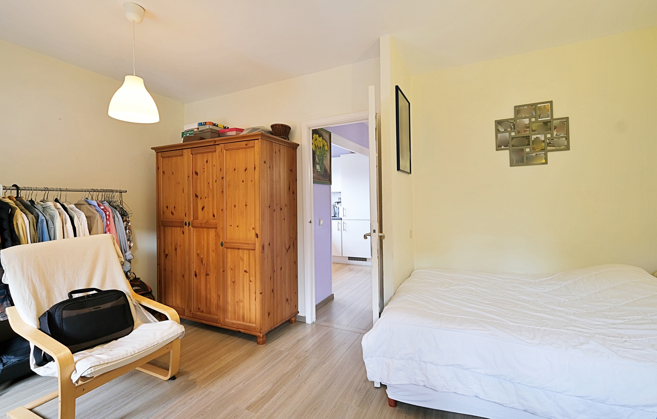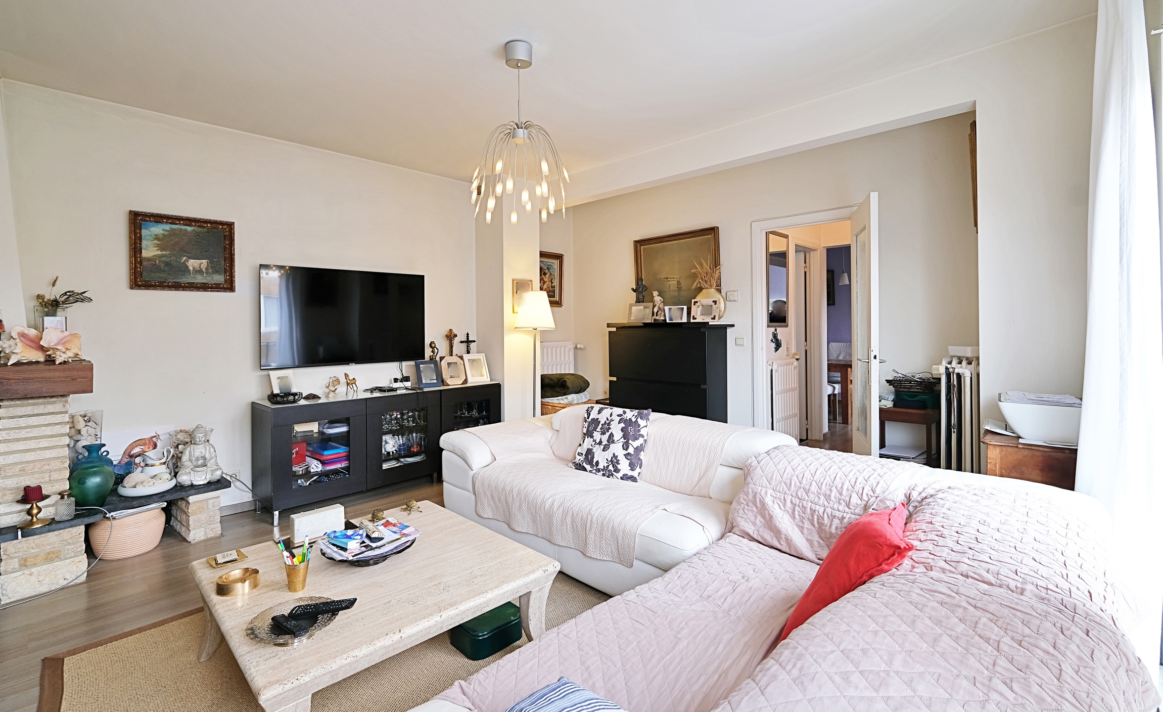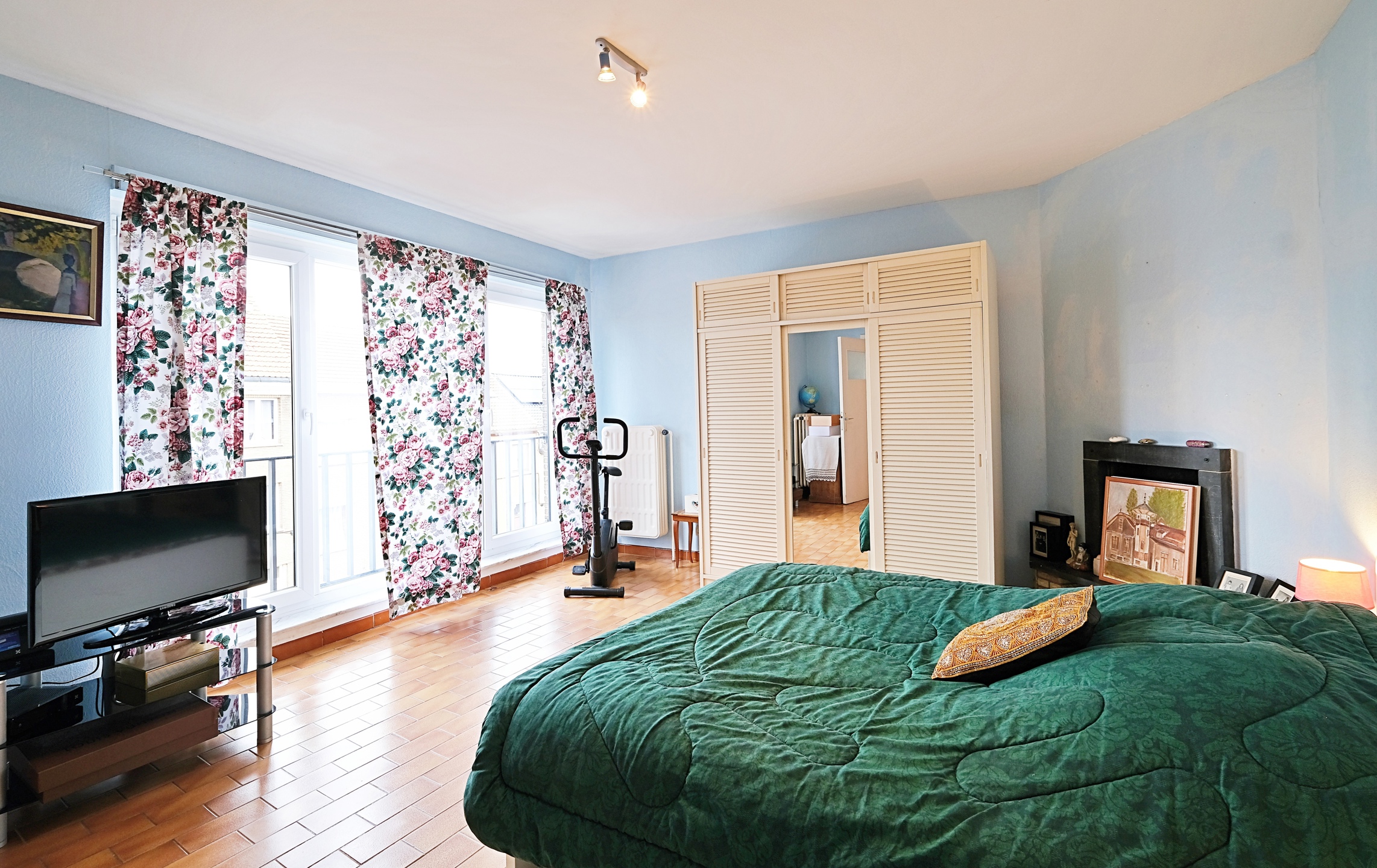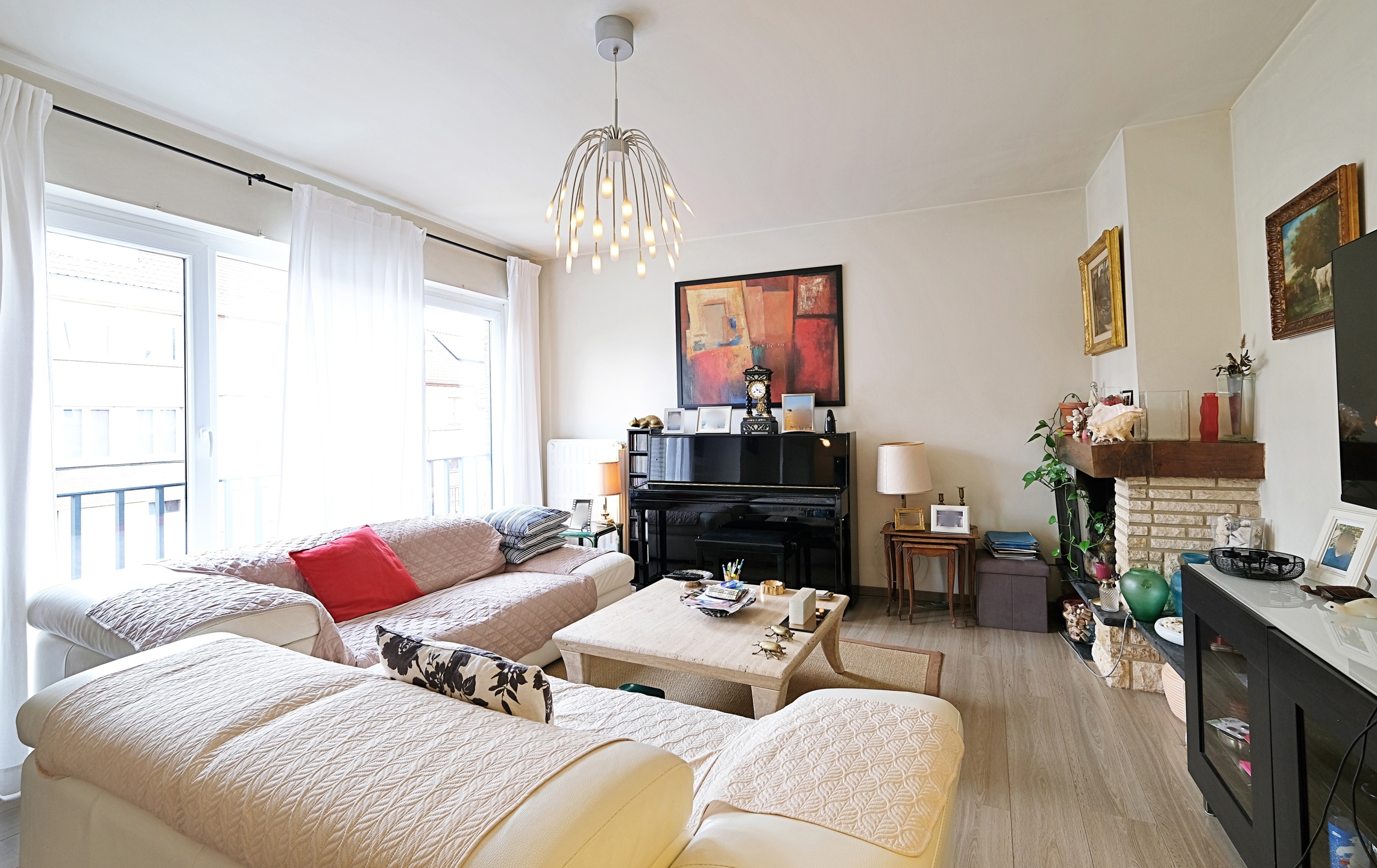 Au 1er, un appartement d'environ 73 m2 (PEB) avec un salon lumineux, une cuisine super équipée, une salle de douche avec WC et une grande chambre de 16 m2.