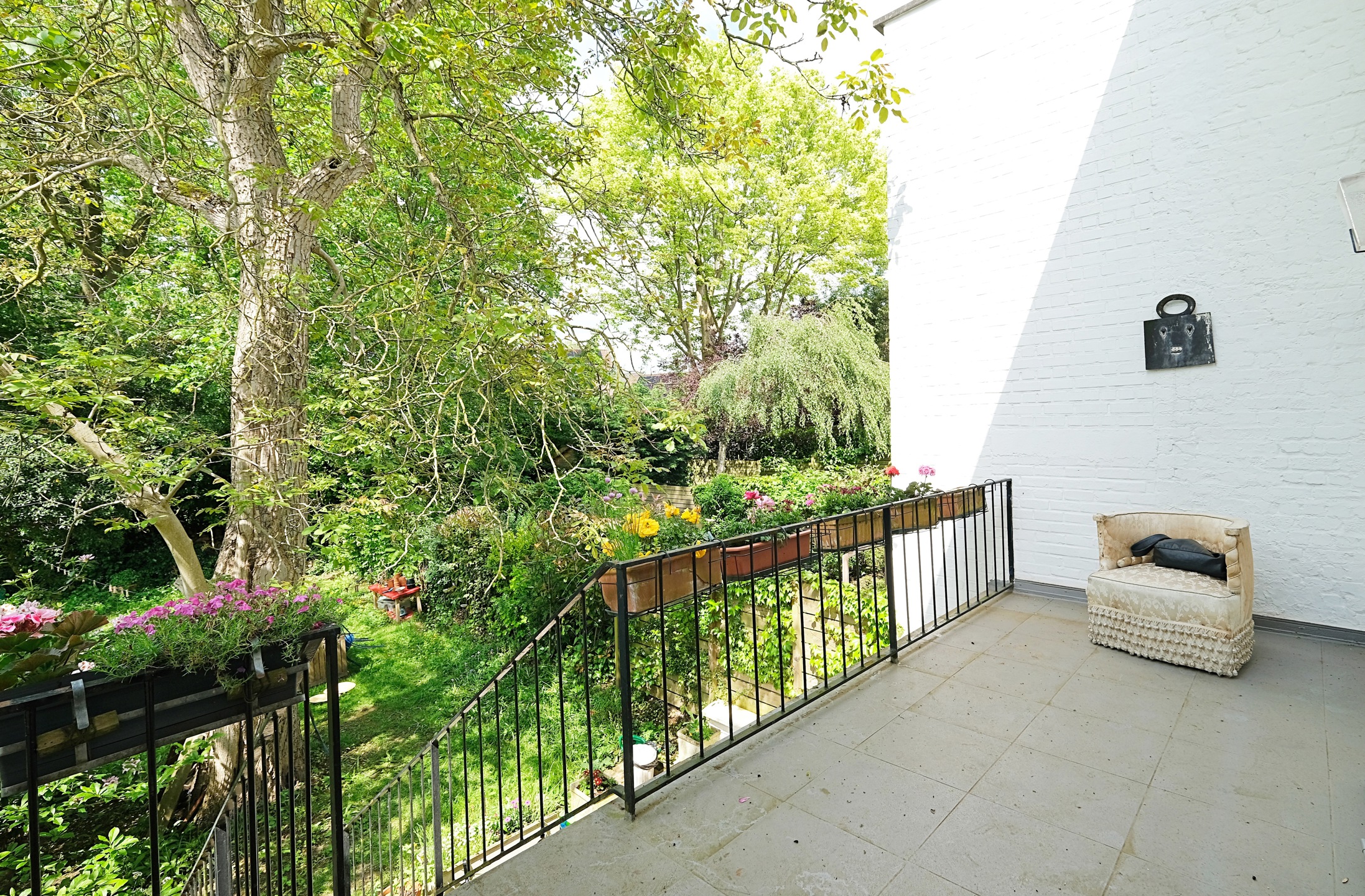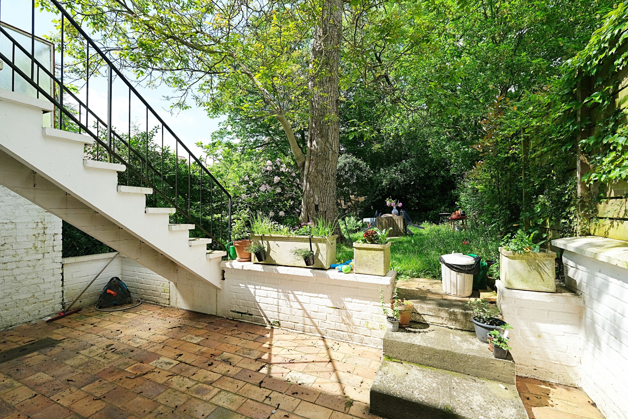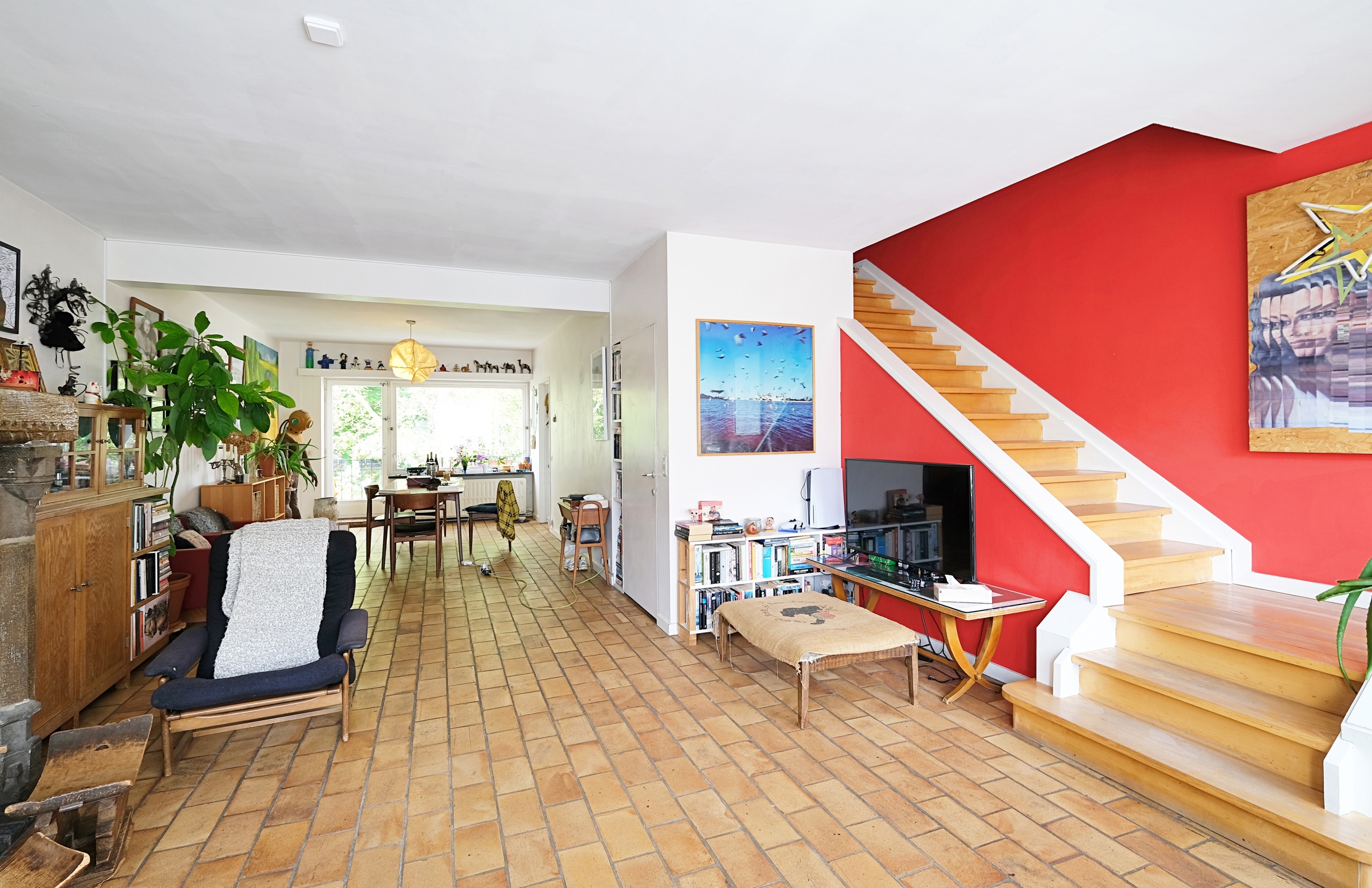 Au 1er étage, une belle pièce de vie d'environ 45 m2 avec feu ouvert, une cuisine équipée, une grande terrasse d'environ 11 m2 avec un escalier pour accéder au jardin et un WC.